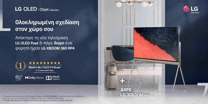 Στο πλαίσιο της προωθητικής ενέργειας που ξεκινά σήμερα, 01 Δεκεμβρίου και θα διαρκέσει μέχρι 31 Δεκεμβρίου[1], οι καταναλωτές θα έχουν τη δυνατότητα να ανακαλύψουν την ολοκληρωμένη σχεδίαση και την ομορφιά που κρύβεται στις λεπτομέρειες της LG OLED Posé και να λάβουν ως δώρο το φορητό ηχείο LG XBOOM 360 RP4.