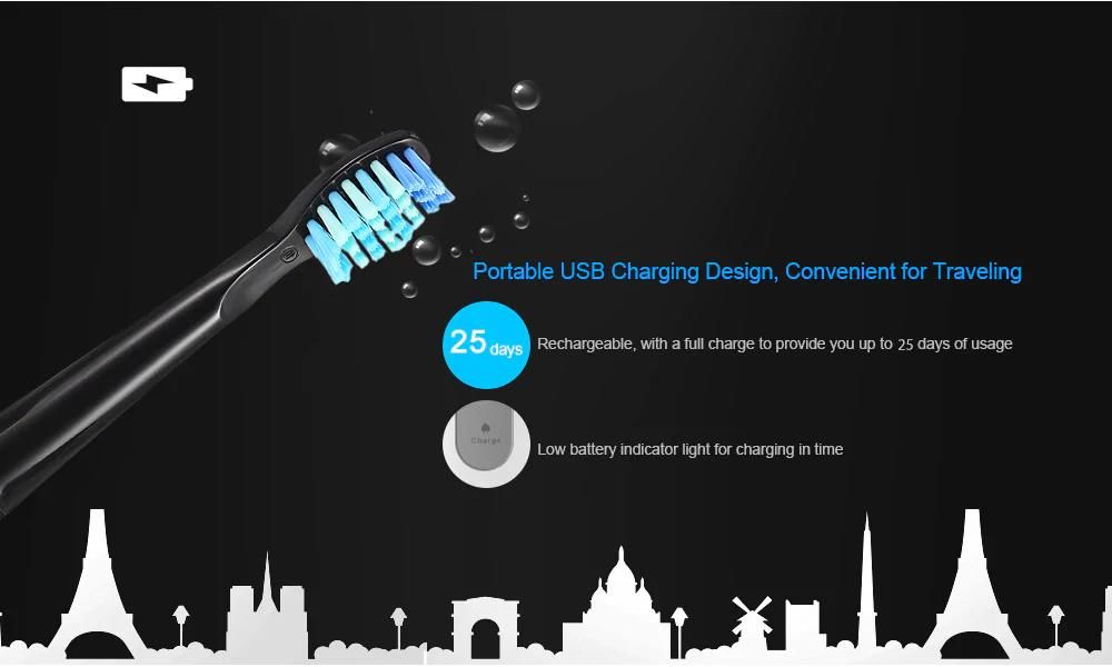 Προκαλεί 40.000 δονήσεις ανά λεπτό, και αφαιρεί τις πλάκες και τους λεκέδες των δοντιών. Φορτίζει την μπαταρία του μέσω USB, και με λιγότερο από 8 ώρες φόρτισης μπορεί να χρησιμοποιηθεί για τουλάχιστον 25 ημέρες. Έρχεται με 3 κεφαλές βουρτσών, είναι πολύ βολικό και υγιές Gadget για όλους μας. Είναι επίσης αδιάβροχη (IPX7), και μπορείτε να την χρησιμοποιήσετε με ασφάλεια στο μπάνιο.