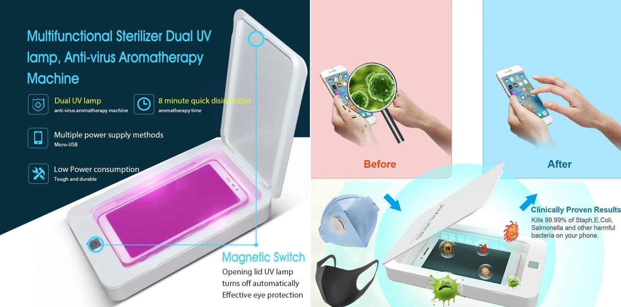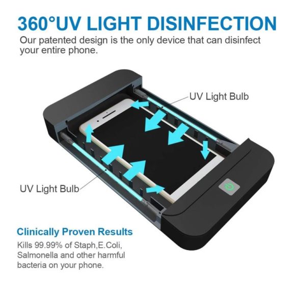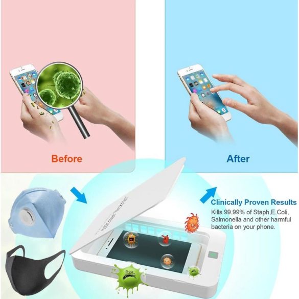 Προστατεύει τις συσκευές σας από τους ιούς και τα βακτήρια, σκοτώνοντάς τους με υπεριώδη ακτινοβολία, αφού καταστρέφει γρήγορα τη δομή DNA και RNA που έχουν. Παρέχει ποσοστό απολύμανσης στο Ε. Coli έως 99,99%, έως 99,99% στους Candida albicans 99,99% και ποσοστό απολύμανσης στο Staphylococcus aureus έως 99,99%.