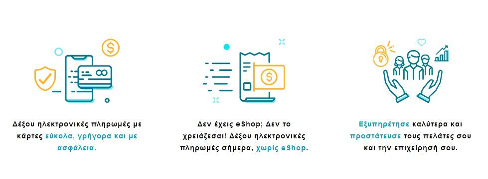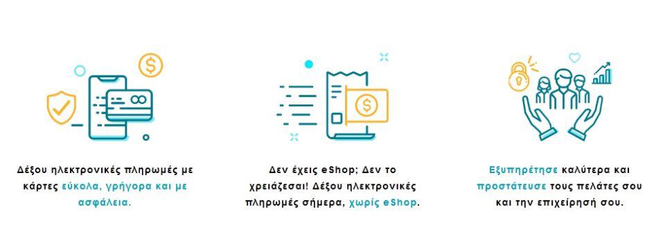 Η νέα υπηρεσία εξασφαλίζει την επιχειρηματική εξέλιξη και βιωσιμότητα μιας επιχείρησης, επιτρέποντας στους πελάτες της να συνεχίσουν να αγοράζουν προϊόντα ή υπηρεσίες πληρώνοντας online, γρήγορα, εύκολα και με ασφάλεια. Πρόκειται για μία εναλλακτική λύση στις ηλεκτρονικές πληρωμές και τις πληρωμές με μετρητά που ενισχύει τις πωλήσεις, ενώ παράλληλα η επιχείρηση εξυπηρετεί καλύτερα και προστατεύει τους πελάτες της μέσω των ανέπαφων πληρωμών και παραδόσεων προϊόντων (contactless delivery).