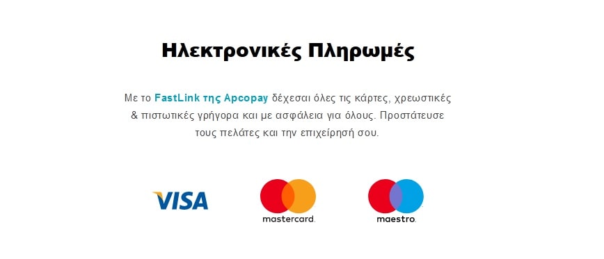 Η υπηρεσία Fastlink δεν απαιτεί την ύπαρξη ηλεκτρονικού καταστήματος, ούτε τεχνικό εξοπλισμό (π.χ. POS, ePOS), ενώ οι συναλλαγές πραγματοποιούνται με απόλυτη ασφάλεια, μέσω της PCIDSS (level 1) πιστοποιημένης πλατφόρμας πληρωμών της Apcopay, εφαρμόζοντας όλα τα σύγχρονα πρωτόκολλα ασφάλειας (Strong Customer Authentication -SCA & 3D Secure 2.0).