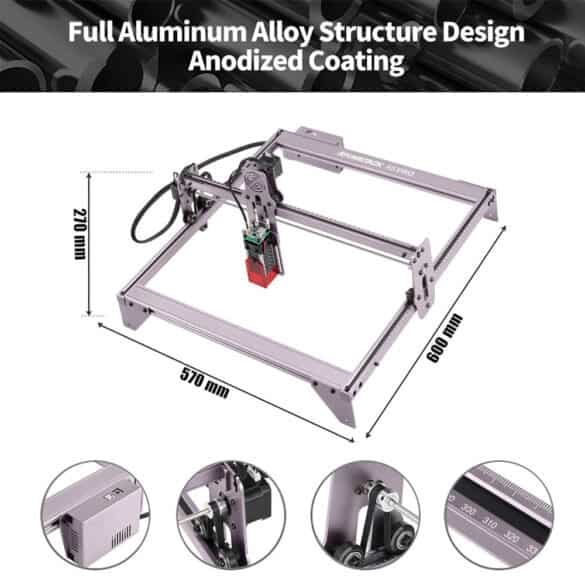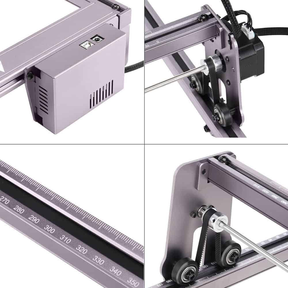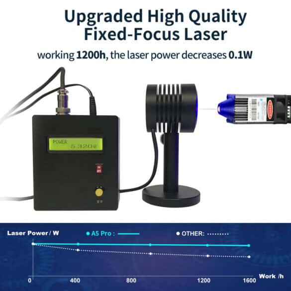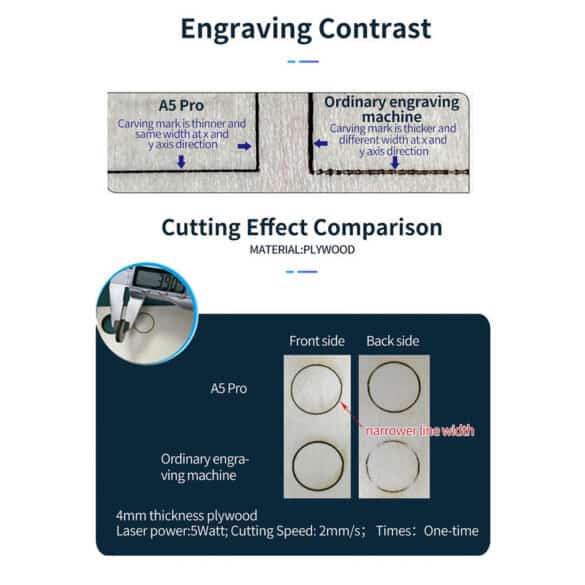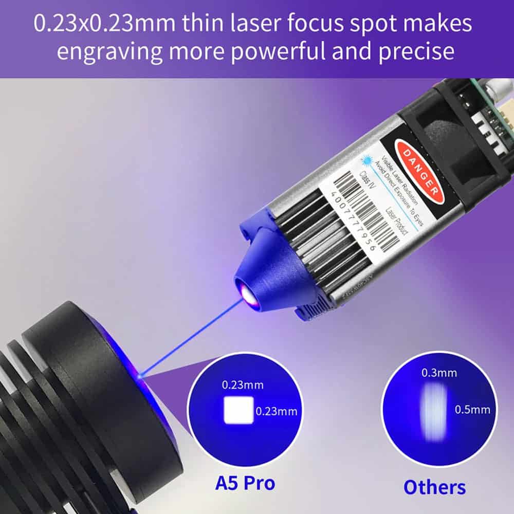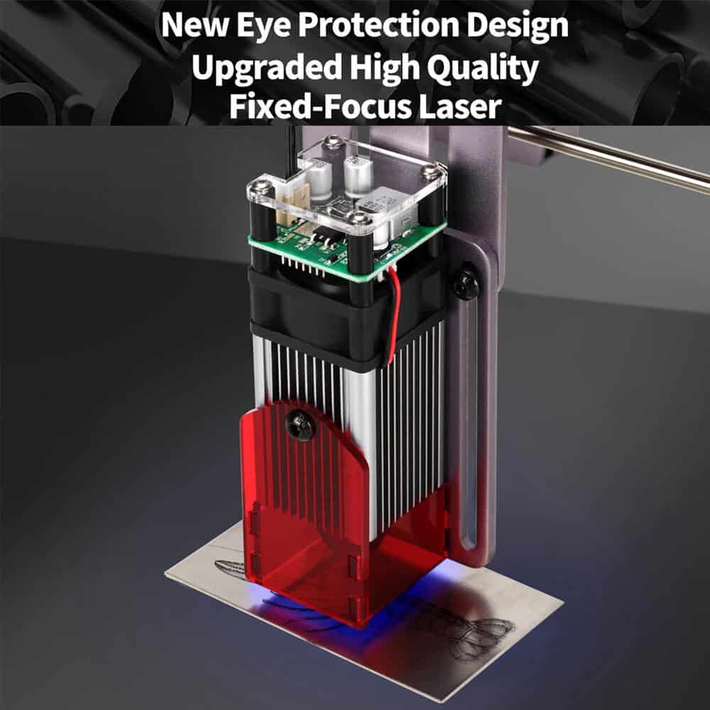 Ultra-Fine Compression Laser : Η ισχύς του λέιζερ είναι στα 4,5-5W, και η χάραξη σε αυτή την υψηλή ισχύ είναι ταχύτερη και ακριβέστερη. Η εξαιρετικά λεπτή περιοχή εστίασης τις ακτίνας του λέιζερ μειώνεται στα 0,23 mm ^ 2, και έχει υψηλής πυκνότητας ακτίνα που μπορεί εύκολα να κόψει ξύλο πάχους μέχρι τα 12 mm και μαύρο ακρυλικό, ενώ μπορεί να χαράξει άμεσα ομαλές ανοξείδωτες μεταλλικές επιφάνειες και και κεραμικά.