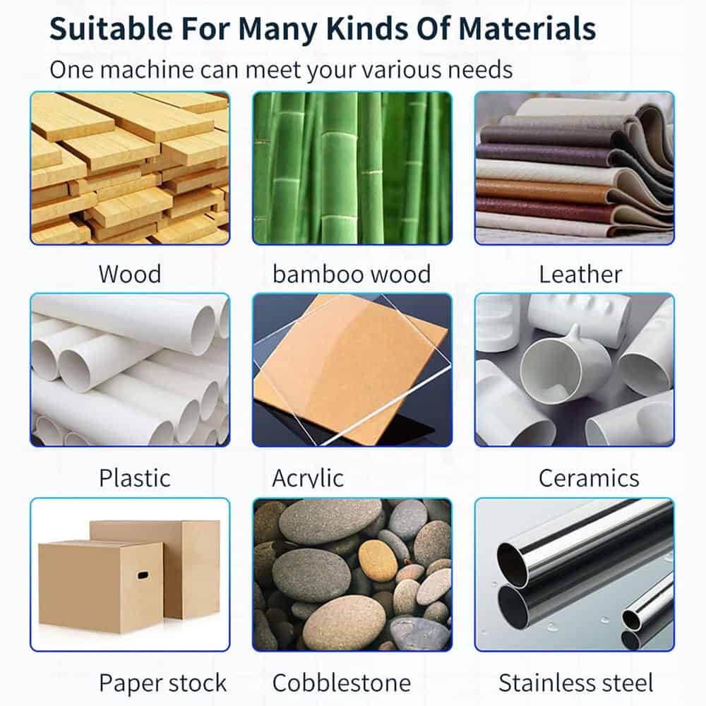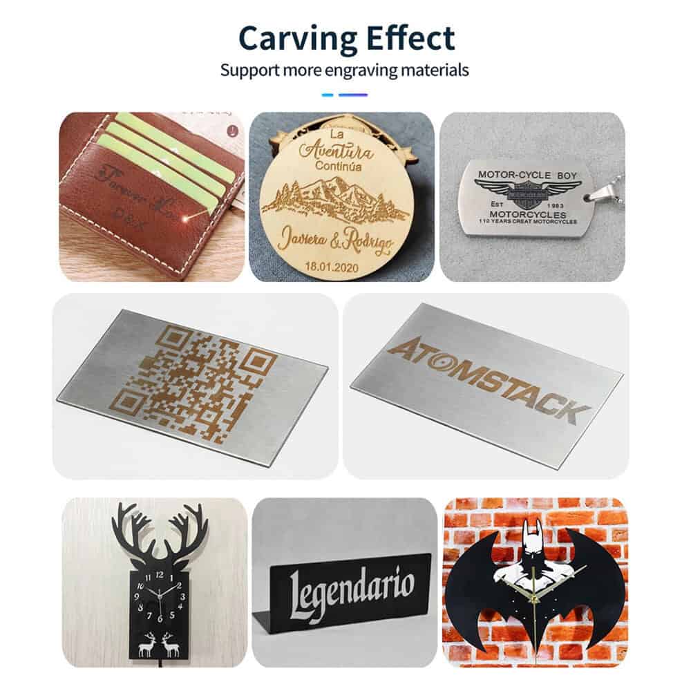 Carving Objects: All wood, bamboo, paperboard, plastic, leather, PCB board, aluminum oxide, non-reflective plating and lacquered metal.