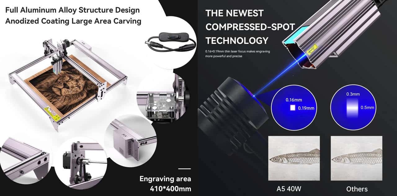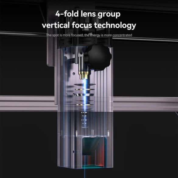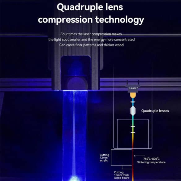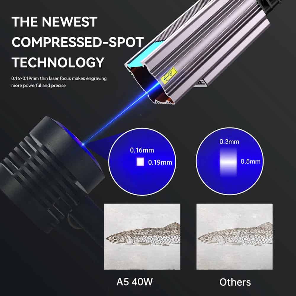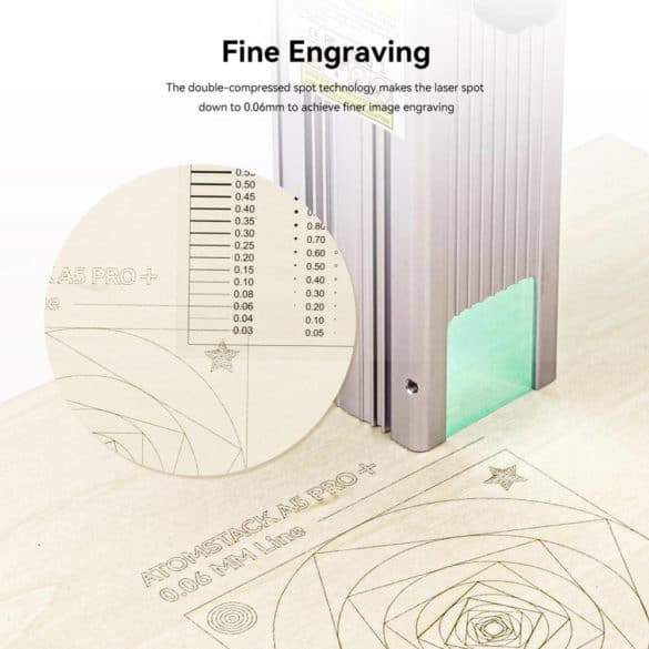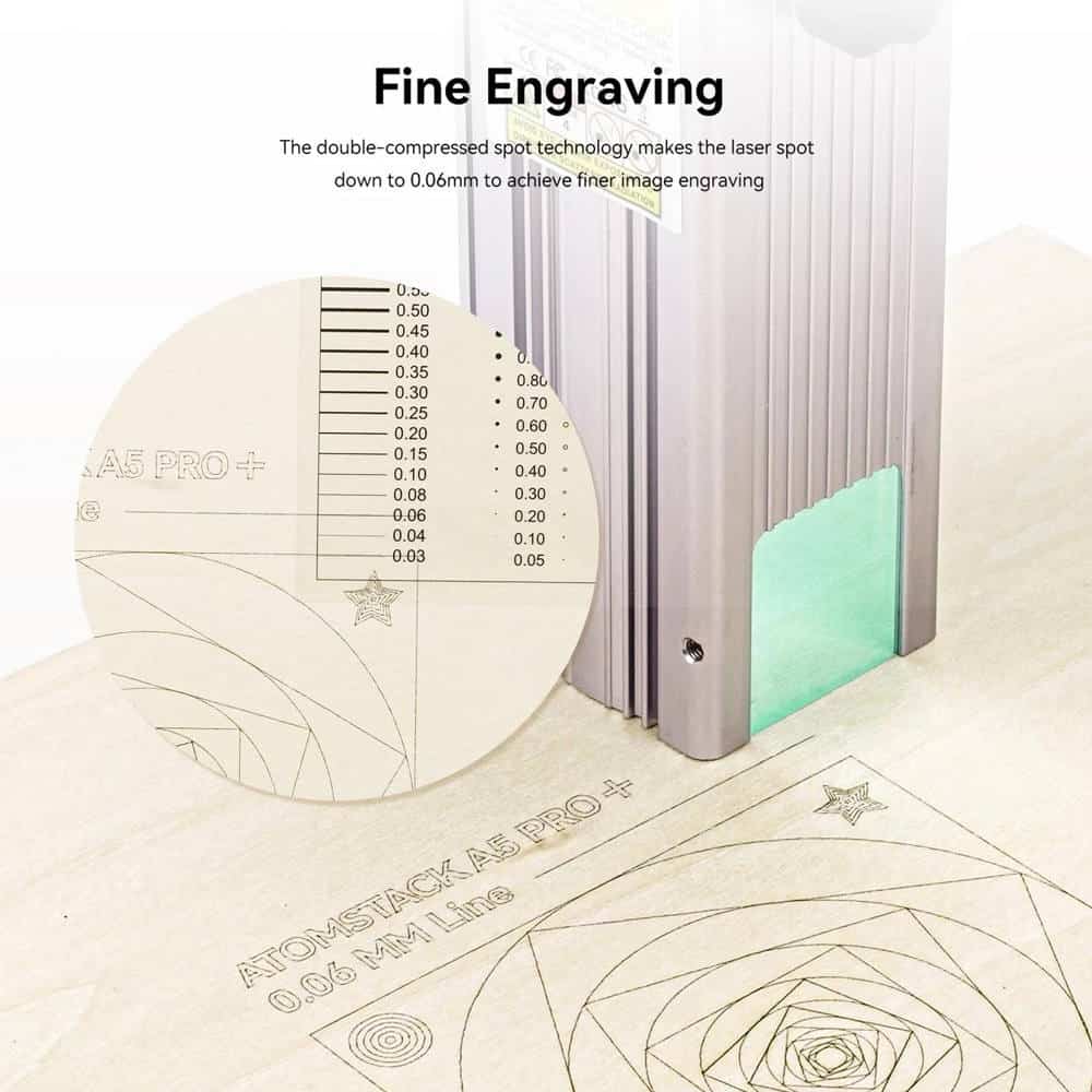 Ultra-Fine Compression Laser : Η ισχύς του λέιζερ είναι στα 5,5W, και η χάραξη σε αυτή την υψηλή ισχύ είναι ταχύτερη και ακριβέστερη. Η εξαιρετικά λεπτή περιοχή εστίασης τις ακτίνας του λέιζερ μειώνεται στα 0,02 mm², και έχει υψηλής πυκνότητας ακτίνα που μπορεί εύκολα να κόψει ξύλο πάχους μέχρι τα 12 mm και μαύρο ακρυλικό, ενώ μπορεί να χαράξει άμεσα ομαλές ανοξείδωτες μεταλλικές επιφάνειες και και κεραμικά.