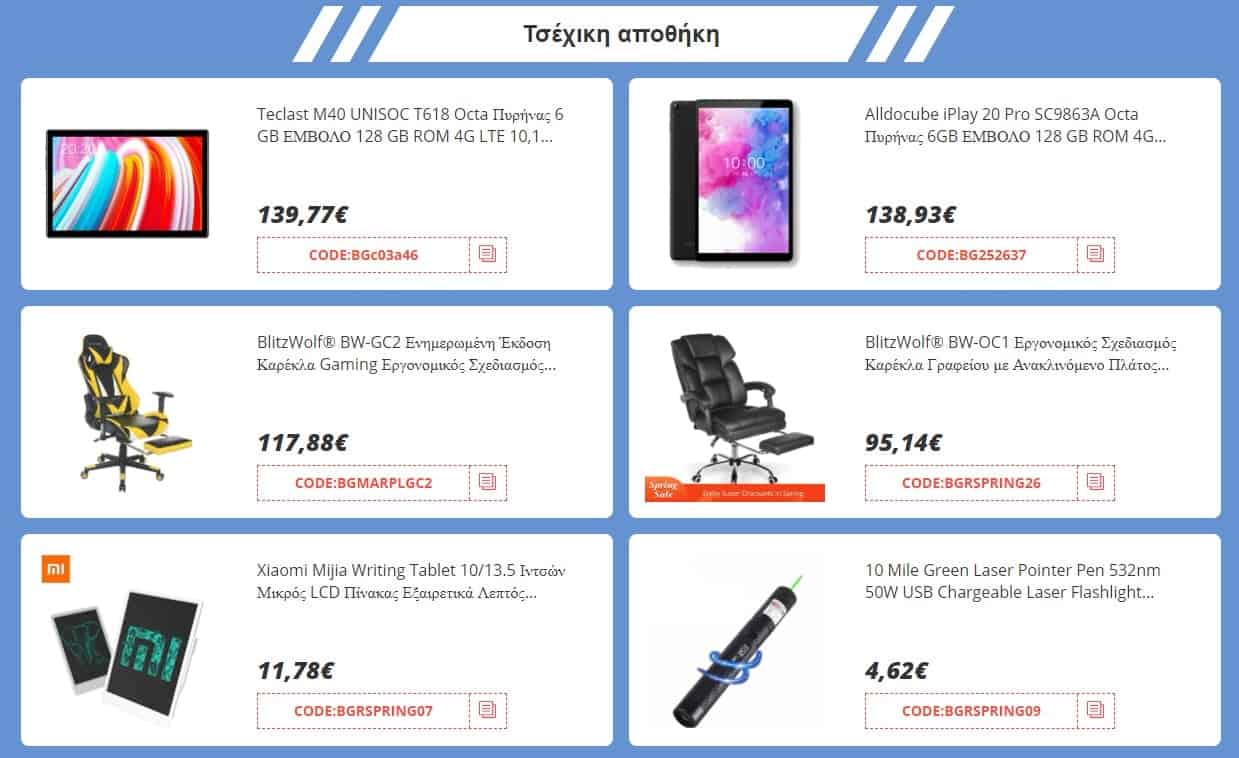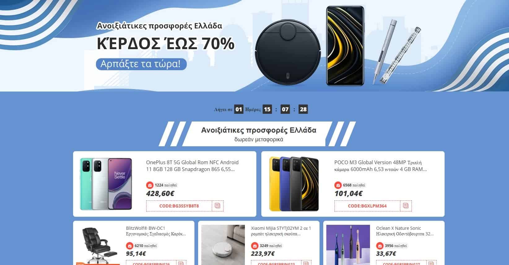 Στην ειδικά διαμορφωμένη σελίδα τους θα βρείτε σχεδόν τα πάντα, από Smartphones, ακουστικά, Smartwatches, Gadgets κάθε είδους, εργαλεία, νέες αφίξεις, έξυπνες συσκευές, οικιακές συσκευές και ότι άλλο βάλει ο νους σας, και μάλιστα ΜΕ ΔΩΡΕΑΝ ΜΕΤΑΦΟΡΙΚΑ.