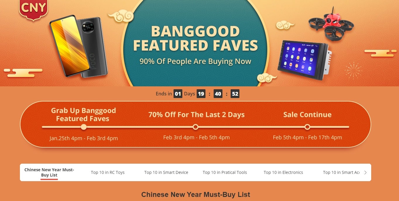 Ο εορτασμός αρχίζει από τις 9 – 16 Φεβρουαρίου, και ήδη το Banggood από σήμερα έχει ξεκινήσει τις ειδικές προσφορές για όλους σας. Αξίζει τον κόπο λοιπόν να ρίξετε μία ματιά στις δύο ειδικά διαμορφωμένες σελίδες του καταστήματος, μέσα στις οποίες θα βρείτε πολύ ενδιαφέρουσες προτάσεις και σε πολύ καλές τιμές, αλλά και με πολλά κουπόνια.