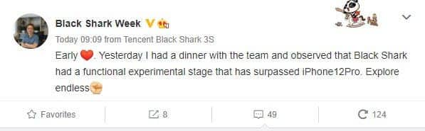 Πιο συγκεκριμένα, το στέλεχος της εταιρείας Luo Yuzhou ισχυρίστηκε στο Weibo ότι το επερχόμενο Black Shark smartphone έχει μια δυνατότητα που βρίσκεται επί του παρόντος σε πειραματικό στάδιο αλλά έχει ήδη ξεπεράσει το iPhone 12 Pro.