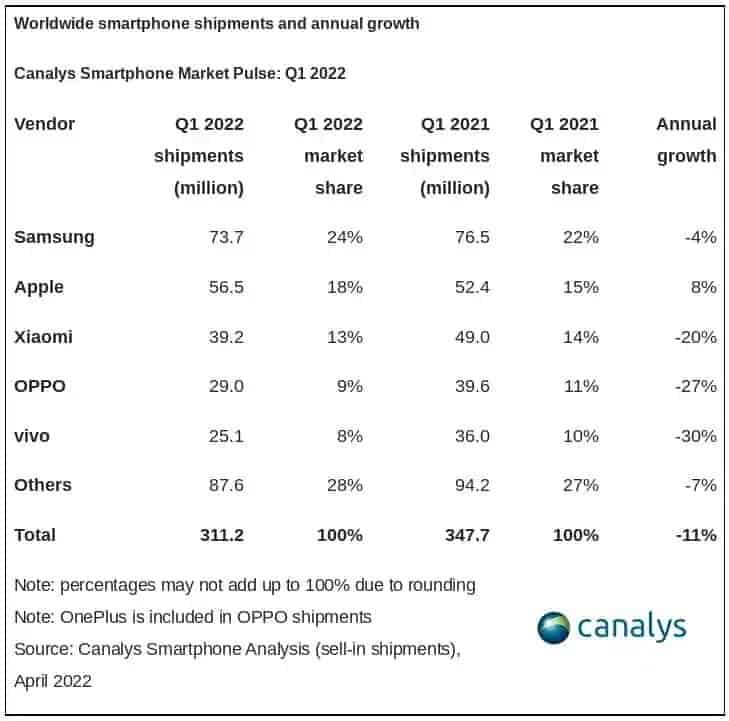 Όπως μπορείτε να δείτε από τα παραπάνω στοιχεία, η Xiaomi, OPPO και Vivo πούλησαν σημαντικά λιγότερα smartphone από ό,τι την ίδια περίοδο πέρυσι, η Apple κατάφερε να αναπτυχθεί ελαφρώς, ενώ οι αποστολές της Samsung μειώθηκαν ελάχιστα. Η Samsung κατέχει επί του παρόντος (1ο τρίμηνο 2022) το 24% της παγκόσμιας αγοράς, σύμφωνα με την Canalys. Ακολουθεί η Apple με 18%, η Xiaomi με 13%, η OPPO με 9% και η Vivo με 8%, ενώ όλοι οι υπόλοιποι OEM κατασκευαστές κατέχουν το 28% της αγοράς.