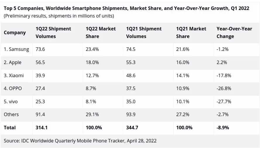 Σύμφωνα με την IDC, η Samsung κατέχει το 23,4% της αγοράς, η Apple το 18%, η Xiaomi το 12,7%, η OPPO το 8,7%, η Vivo το 8,1% και 29,1% όλοι οι υπόλοιποι κατασκευαστές.