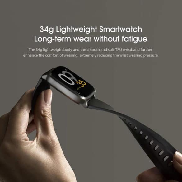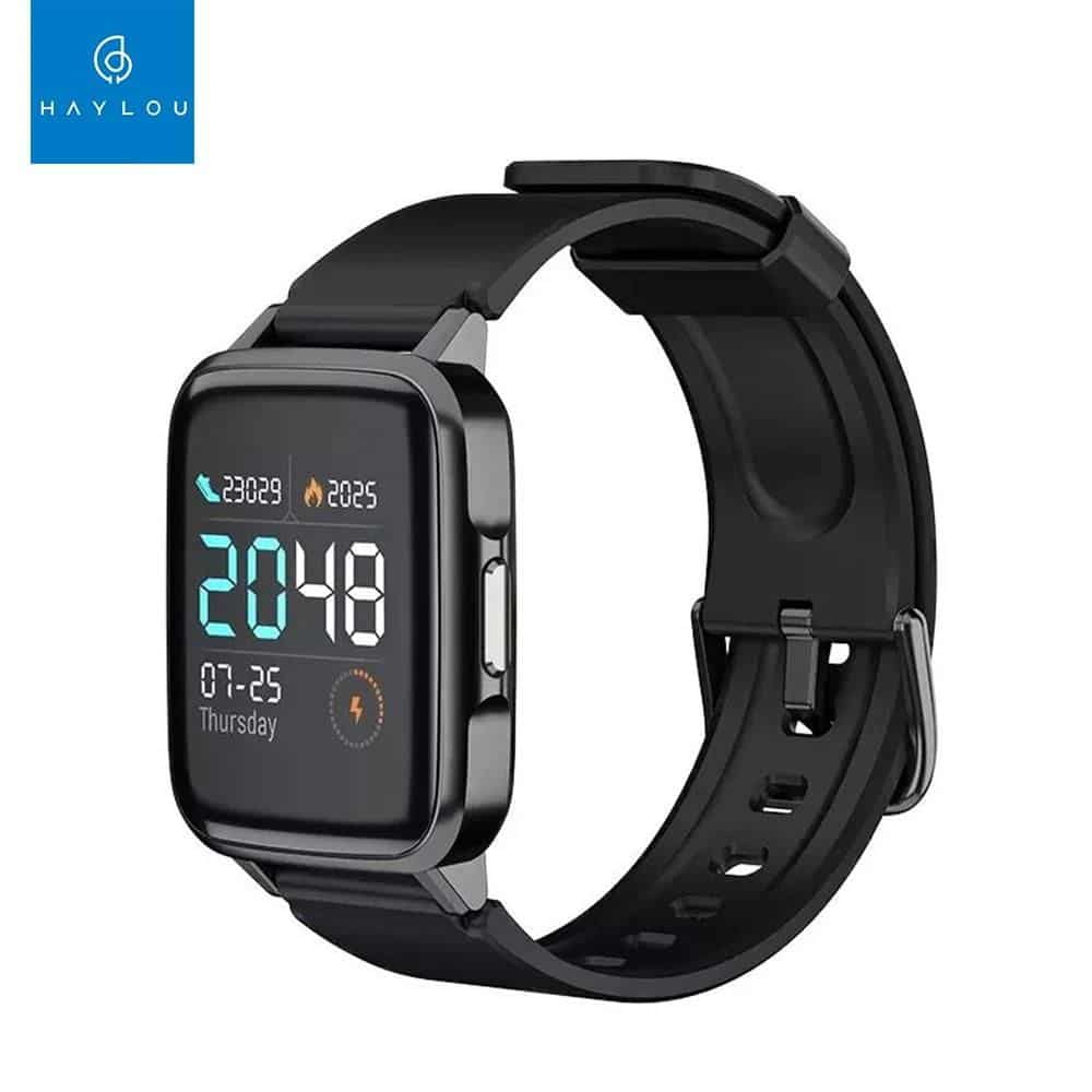 - Body of the Haylou LS01 smartwatch adopts a rectangular design with rounded corners. The size of the smartwatch is 40.9 x 35.7 x 11.6 mm, and the weight is 34 grams. It is very light and can hardly feel its weight on the hand.