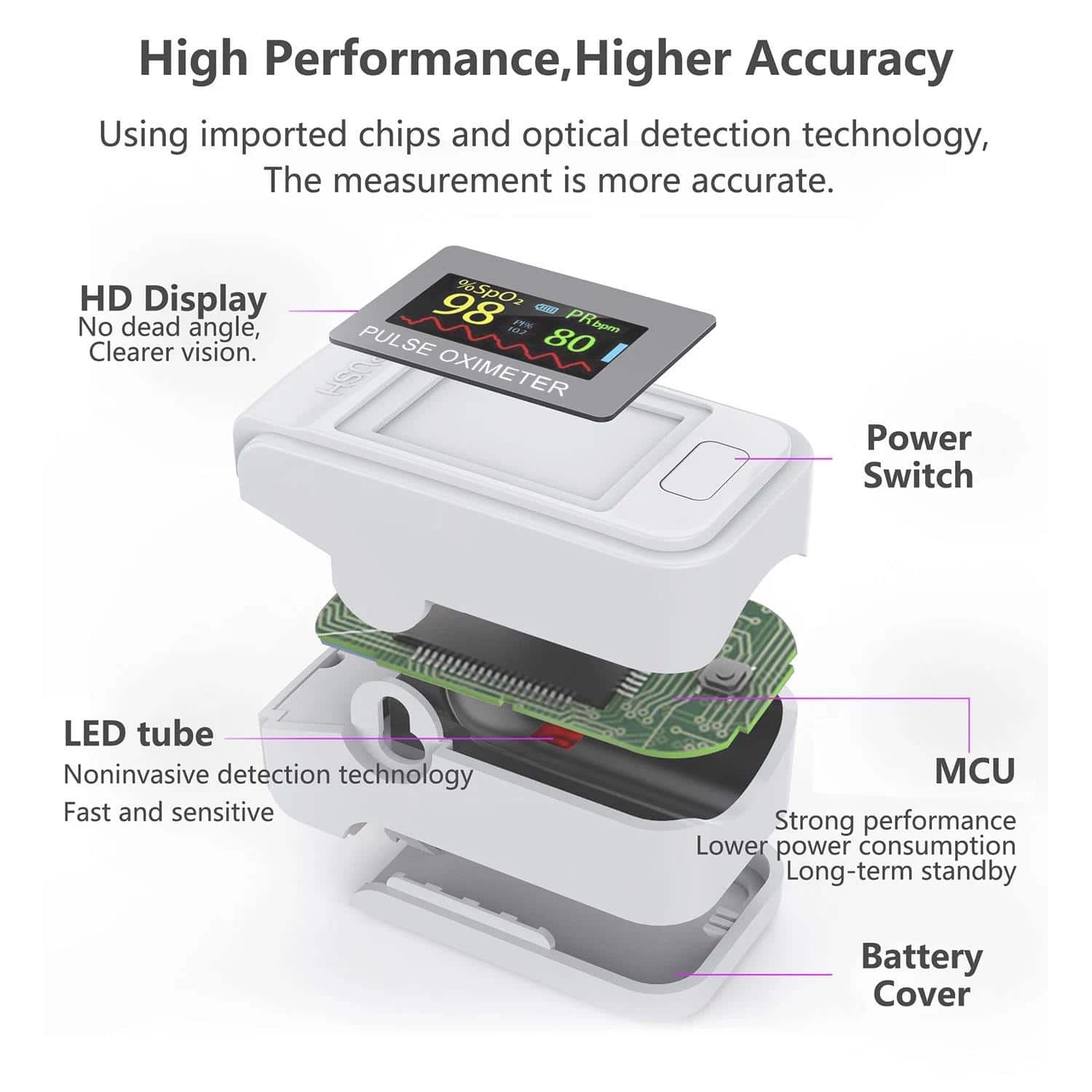 Είναι πολύ εύκολο στη χρήση, ακριβές και αξιόπιστο. Τοποθετήστε το στο δάχτυλό σας και ενεργοποιήστε το με το πάτημα ενός κουμπιού για να αρχίσει αμέσως τις μετρήσεις. Η συσκευή θα απενεργοποιηθεί αυτόματα μετά από 5 δευτερόλεπτα όταν δεν χρησιμοποιείται.