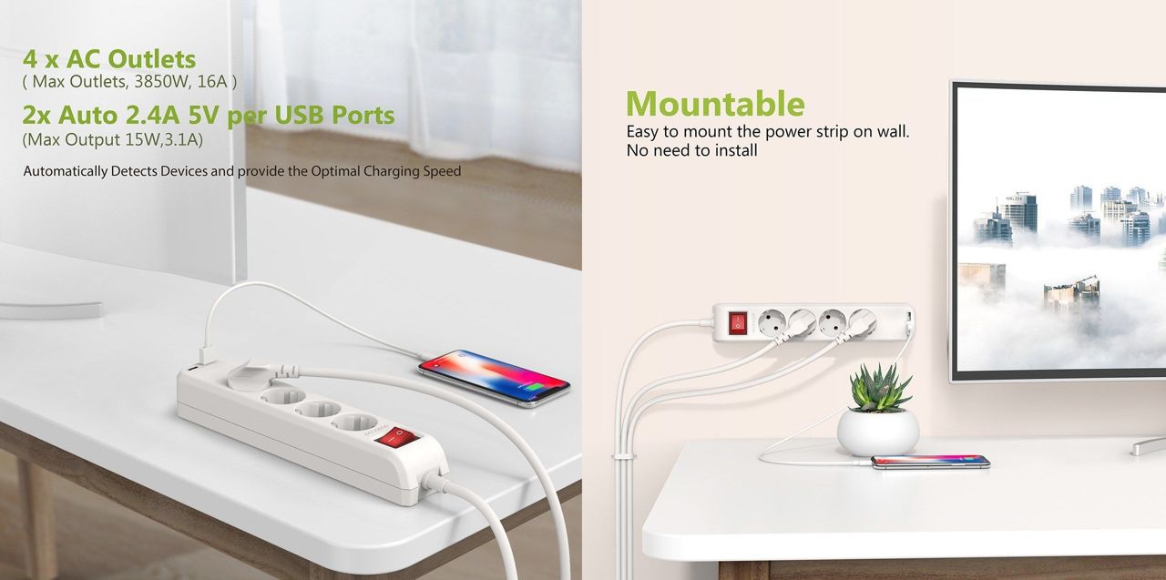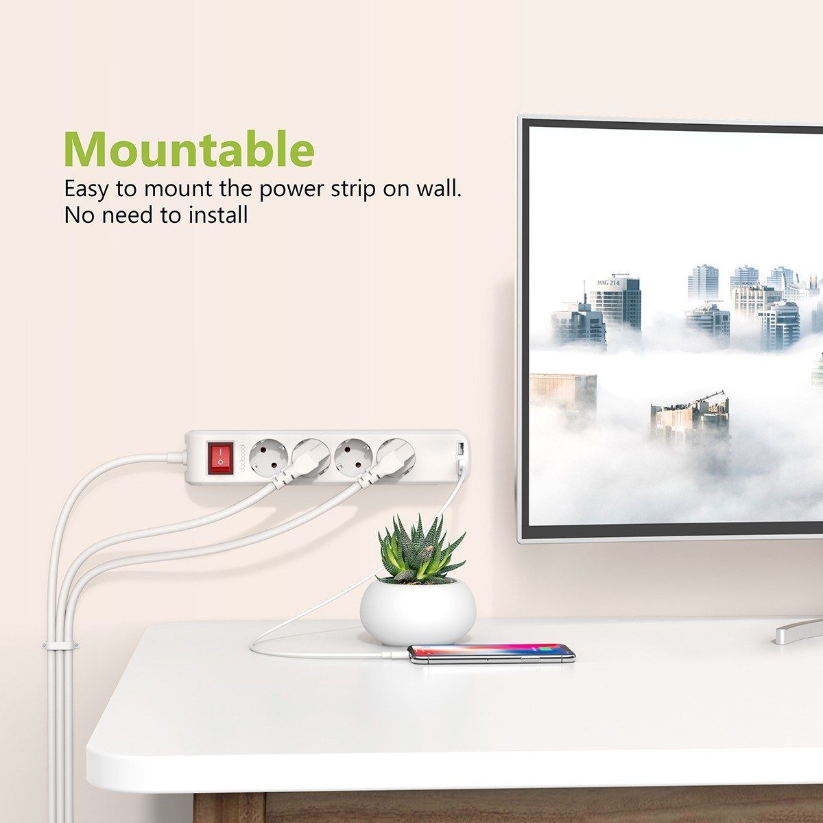 1 * dodocool 4-way Power Strip with 2 USB Charging Ports