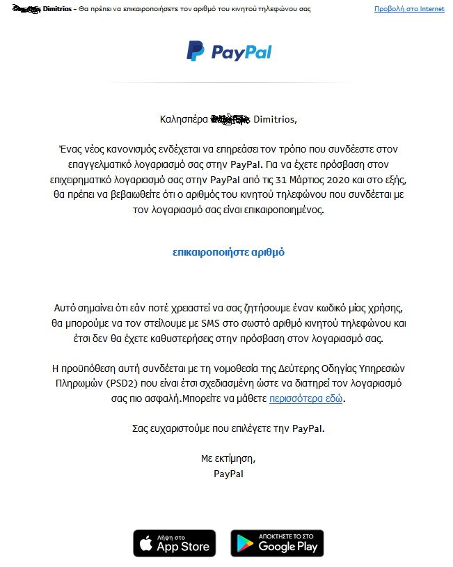Μην πατήσετε πάνω σε κανέναν από τους συνδέσμους που περιέχει γιατί θα σας οδηγήσει σε έναν ψεύτικο κλώνο της σελίδας του Paypal και ίσως πέσετε και θύματα malware κώδικα στο κινητό σας ή στο PC σας με απρόβλεπτες συνέπειες για την ασφάλεια των προσωπικών σας δεδομένων και των λογαριασμών που διατηρείτε για να συνδεθείτε μέσω του WebBanking στην τράπεζά σας.