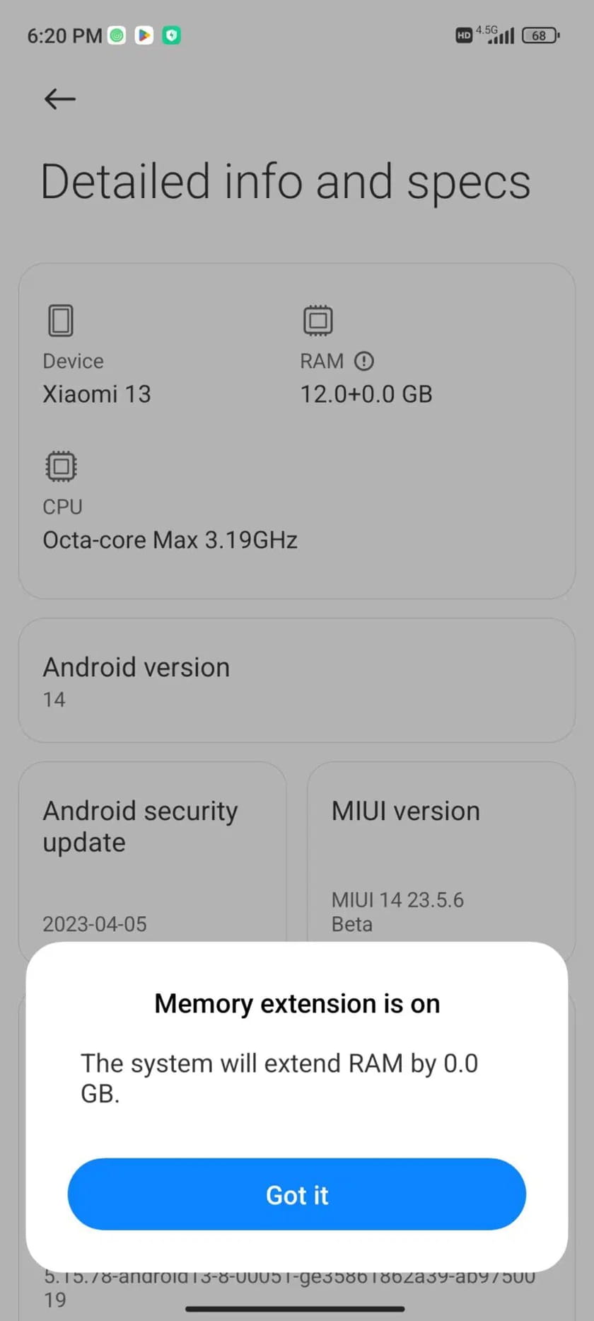 Η έκδοση του MIUI που συνοδεύει το Android 14 Beta 1 είναι η “MIUI 14 23.5.6” και παρατηρήθηκε ότι η διαθέσιμη μνήμη RAM αναφέρεται ως 12GB + 0GB στη σελίδα προδιαγραφών. Πολλοί OEM κατασκευαστές Smartphone έχουν αρχίσει να προσφέρουν την επέκταση της RAM στα τηλέφωνά τους, συνήθως εμφανίζοντάς την ως 12 GB + 3 GB όπως φαίνεται στο δεύτερο στιγμιότυπο οθόνης (σταθερή έκδοση του Android 13).