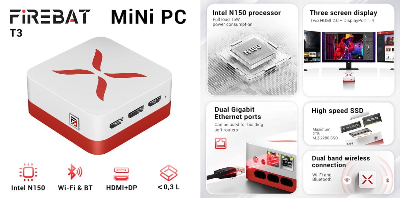FIREBAT T3 Mini PC (Intel N150 4 Cores Max 3.6GHz, 12GB RAM 512GB SSD)