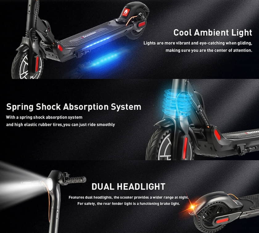 Το μπροστινό μέρος του πιρουνιού αυτού του ηλεκτρικού σκούτερ έχει διπλά αμορτισέρ για απορρόφηση και απόσβεση των κραδασμών. Έτσι θα κάντε την οδηγική σας εμπειρία πιο άνετη, ακόμα και όταν οδηγείτε σε ανώμαλους δρόμους, κάθώς θα μπορεί να απορροφήσει καλά όλους τους κραδασμούς.
