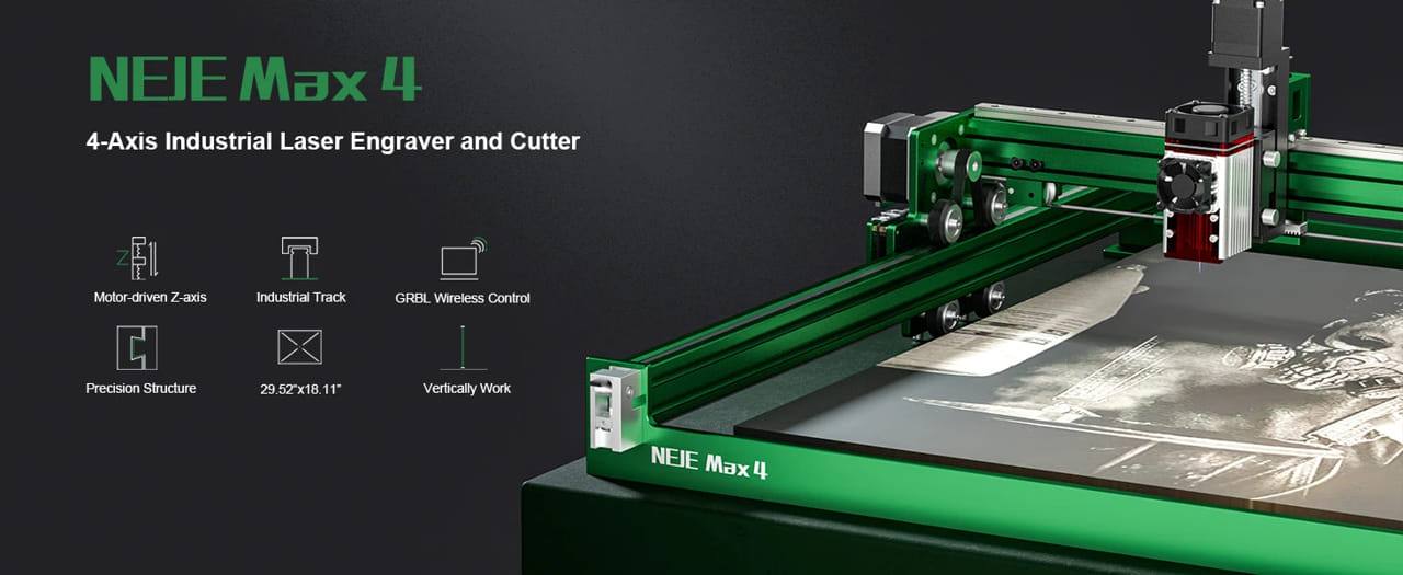 Το NEJE Max 4 είναι μια ευέλικτη και υψηλής απόδοσης μηχανή χάραξης και κοπής λέιζερ μεγάλης επιφάνειας DIY με νέα και καινοτόμο σχεδιαστική ιδέα. Διαθέτει ανεξάρτητο έλεγχο 4 αξόνων, πράγμα που σημαίνει ότι μπορείτε να βελτιώσετε την αποτελεσματικότητα και να απελευθερώσετε τη δημιουργικότητα στον πολυδιάστατο χώρο.