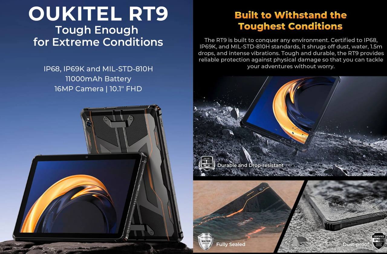 Το ανθεκτικό tablet OUKITEL RT9 έχει σχεδιαστεί για χρήση σε εξωτερικούς χώρους, με IP68 (αδιάβροχο 1,5 μέτρο), IP69K (ανθεκτικό στις πτώσεις) και αντοχή στη σκόνη 30 μέτρων. Η οθόνη Corning Gorilla Glass αντιστέκεται σε γρατσουνιές και ζημιές, πληρώντας τις απαιτήσεις του στρατιωτικού προτύπου MIL-SD-810H, καθιστώντας την ιδανική επιλογή για αγρότες, ανθρακωρύχους ή εξερευνητές.