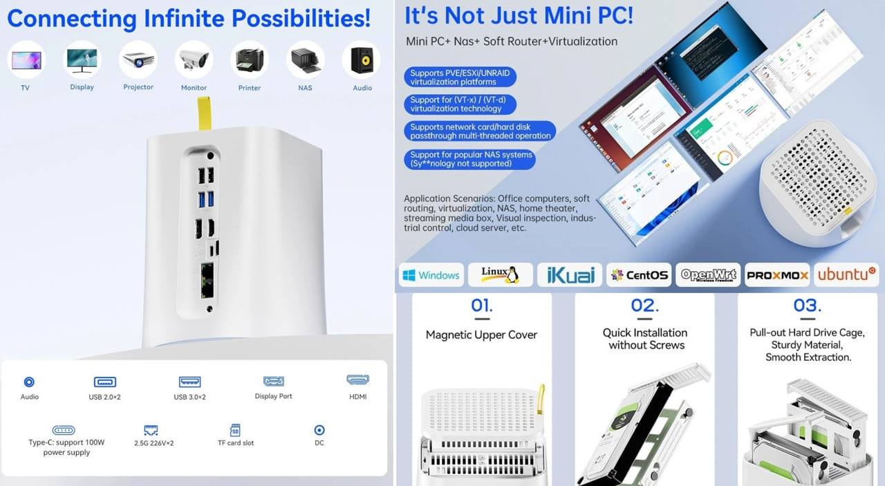 Είναι όχι μόνο ένας μίνι υπολογιστής, αλλά και ένας ικανότατος δρομολογητής. Υποστηρίζει τα δημοφιλή συστήματα NAS (για να χρησιμοποιήσετε τη λειτουργία NAS, θα πρέπει να εγκαταστήσετε μόνοι σας το αγαπημένο σας λογισμικό NAS), υποστηρίζει τεχνολογία εικονικοποίησης και πλατφόρμες εικονικοποίησης.