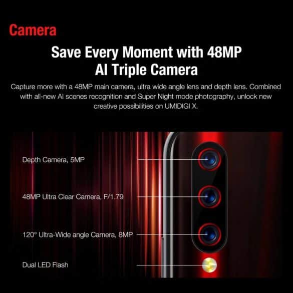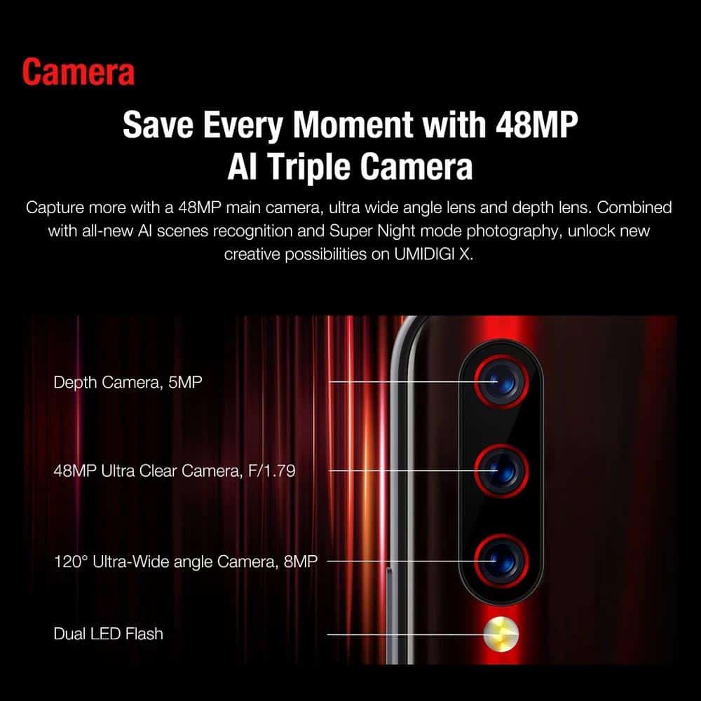 Triple rear cameras: 48MP(F/1.79) +8MP(120° Ultra-Wide angle )+5MP(Depth Camera)