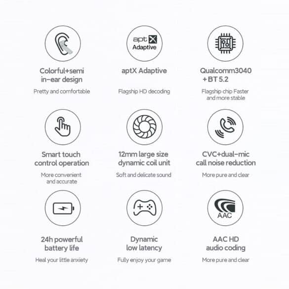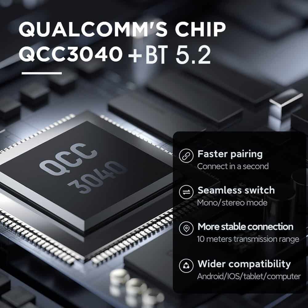 • The latest Qualcomm QCC3040 chip, BT 5.2 technology, powerful tri-core processor architecture, and Qualcomm TrueWireless Mirroring technology for improved robustness and seamless user experience.