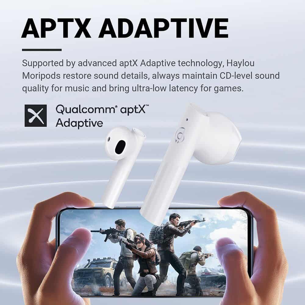 Η νέα τεχνολογία aptX (adaptive dynamic adaptive decoding technology) έχει την ικανότητα να αναγνωρίζει αυτόματα το περιβάλλον χρήσης και το είδος της μουσικής ή του ήχου που ακούτε, και λειτουργεί με αποκωδικοποίηση ήχου AAC και SBC, παρέχοντας σταθερό –  εξαιρετικά χαμηλό λανθάνοντα χρόνο (low latency) και ήχο εξαιρετικά υψηλής ευκρίνειας, αναπαράγοντας πραγματικά τον ήχο με κάθε λεπτομέρεια.