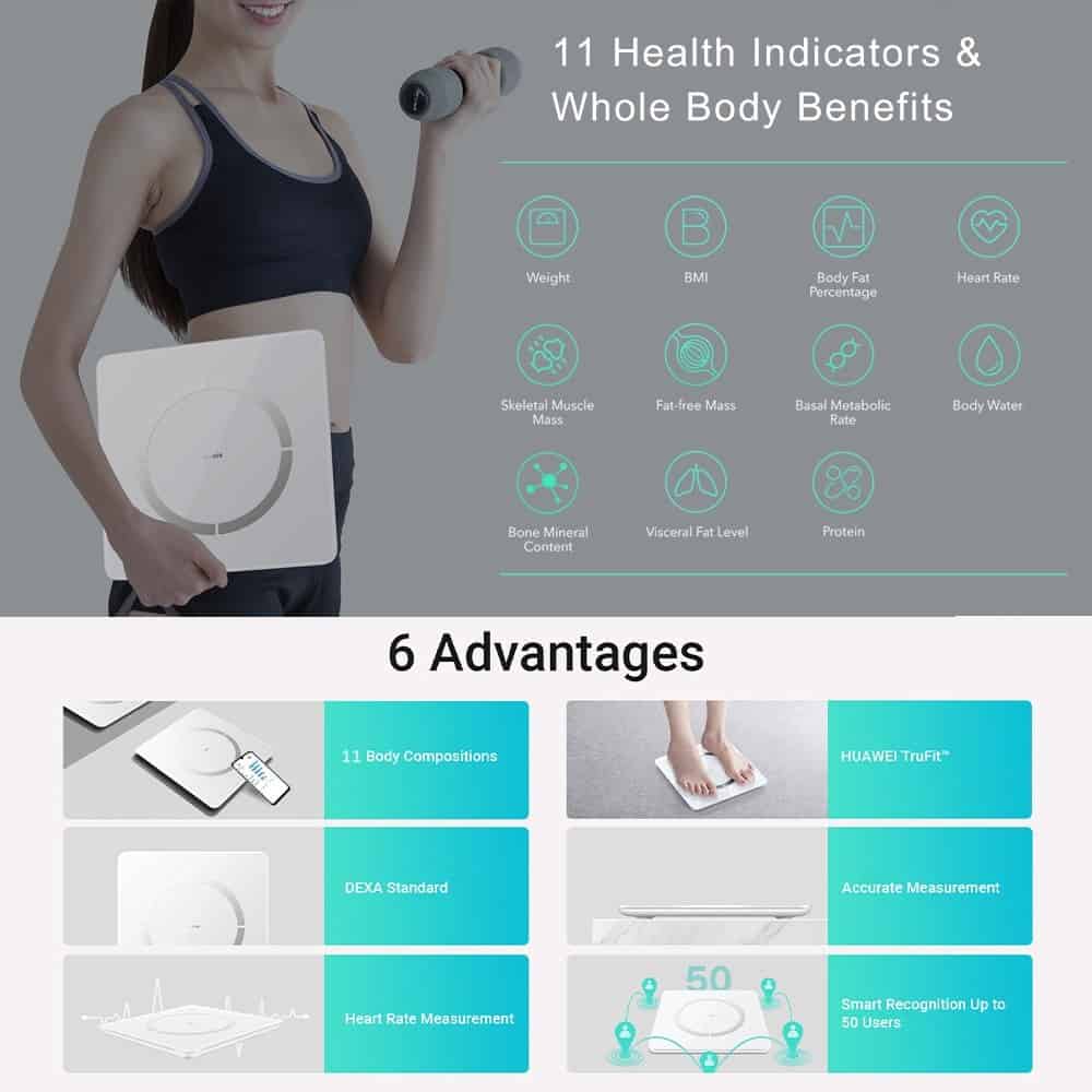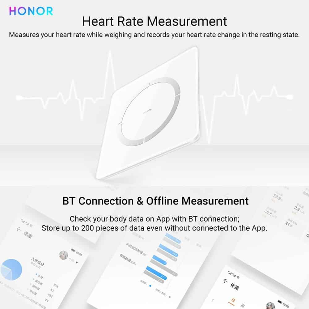 Αυτό η Smart ζυγαριά της Honor μετράει το Βάρος, ΔΜΣ (Δείκτης Μάζας σώματος), τ σπλαχνικό λίπος, την σκελετική μυϊκή μάζα, FFM (μάζα χωρίς λίπος), BMR και με βάση τα παραπάνω στοιχεία μπορεί η εφαρμογή που την συνοδεύει να υπολογίζει το ποσοστό του νερού στο σώμα, την πρωτεΐνη, την οστική μάζα, τον τύπο του σώματος, την σωστή αναλογία βάρους του σώματος με το ύψος ανάλογα με την φυσική ηλικία.