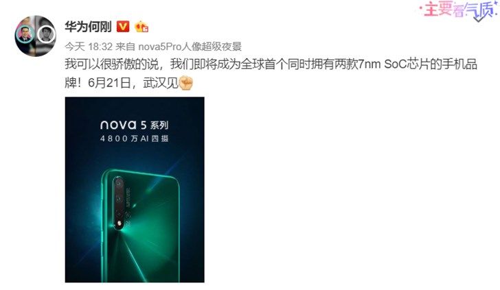 Σήμερα, ο πρόεδρος της σειράς προϊόντων smartphone της Huawei, He Gang, δημοσίευσε ένα μήνυμα: «Είμαστε έτοιμοι να γίνουμε το πρώτο εμπορικό σήμα στον κόσμο των smartphones, με δύο SoC στα 7nm».