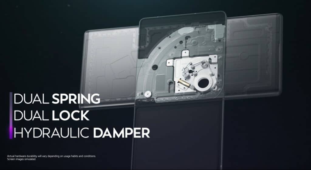 Η ειδική μονάδα του μεντεσέ που διαθέτει είναι εφοδιασμένη με υδραυλικό αποσβεστήρα που μειώνει την πίεση στον μηχανισμό όταν περιστρέφεται η κύρια οθόνη,  και το ειδικό θερμοπλαστικό πολυοξυμεθυλένιο υλικό με το οποίο είναι επικαλυμμένο το πίσω μέρος της κύριας οθόνης, διευκολύνει την ομαλότερη περιστροφή και αποτρέπει τις γρατσουνιές στη δεύτερη οθόνη, όπως δήλωσε η LG. Η εταιρεία λέει ότι αυτός ο ειδικός μηχανισμός του μεντεσέ έχει δοκιμαστεί για περισσότερες από 200.000 περιστροφές χωρίς πρόβλημα.