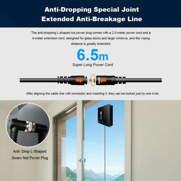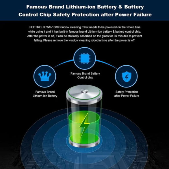 Μπαταρία μεγάλης χωρητικότητας και προστασία ασφάλειας μετά από διακοπή ρεύματος : Η συσκευή πρέπει να τροφοδοτείται συνεχώς κατά τη χρήση της και έχει ενσωματωμένη μπαταρία ιόντων λιθίου 650 mAh και τσιπ ελέγχου της μπαταρίας. Αυτό εξασφαλίζει ότι η συσκευή θα μπορεί να παραμείνει σταθερή επάνω στο γυαλί για 30 λεπτά για να αποφευχθεί η πτώση, και θα σας δώσει τον απαραίτητο χρόνο ώστε να αφαιρέστε εγκαίρως την συσκευή από τις κάθετες επιφάνειες.