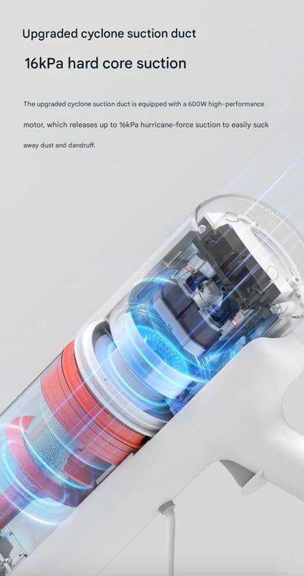 - Βελτιωμένος κινητήρας τύπου κυκλώνα : Εξοπλισμένη με κινητήρα κυκλώνα 600W, αυτή η ηλεκτρική σκούπα δίνει εκπληκτική ισχύ αναρρόφησης στα 16kPa για να εξασφαλίσει λεπτομερή καθαρισμό σκόνης και συντριμμιών.