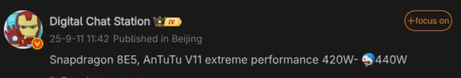 Σύμφωνα με τον tipster Digital Chat Station, το Snapdragon 8 Elite Gen 5 σκοράρει μεταξύ 4.20 και 4.40 εκατομμυρίων πόντων στο AnTuTu v11. Αυτό το καθιστά ως το SoC με τον υψηλότερο αριθμό απόδοσης που έχουμε δει για οποιονδήποτε επεξεργαστή σε Smartphone μέχρι στιγμής στο σημείο αναφοράς του Antutu V.11.