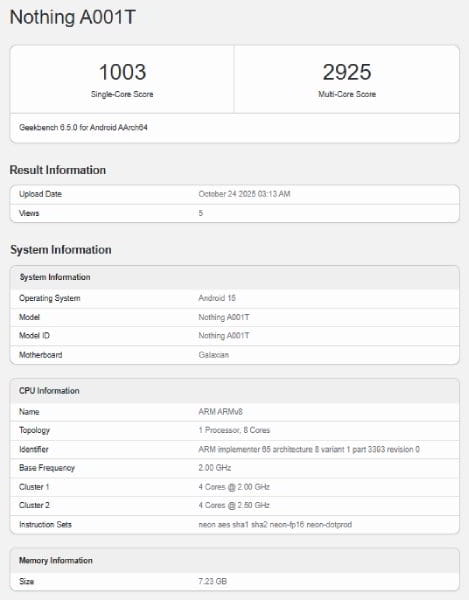 Ο κωδικός μοντέλου που διαθέτει η συσκευή είναι Nothing A001T και αποκαλύπτεται πως τροφοδοτείται από το Dimensity 7300 της MediaTek συνδυαστικά με RAM στα 8GB. Όσο για το λειτουργικό, με βάση την καταχώρηση φαίνεται πως θα τρέχει την έκδοση Android 15.