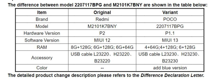 Η καταχώρηση στην βάση δεδομένων μας δείχνει ότι η συσκευή έχει κωδικό μοντέλου 2207117BPG, και όλα δείχνουν πως θα είναι μια μετονομασία του Redmi Note 10S, καθώς οι προδιαγραφές της συσκευής είναι πανομοιότυπες με τοSmartphone της RedMi.
