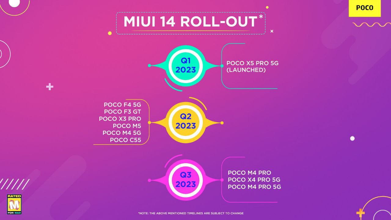 Στην λίστα περιλαμβάνεται και το δημοφιλές Poco F4 που βρίσκεται ήδη στην έκδοση beta του MIUi 14 με υποστήριξη για το αυτόνομο δίκτυο True 5G της Reliance Jio. Η σταθερή έκδοση του MIUI 14 για αυτή την συσκευή αναμένεται να κυκλοφορήσει κατά το 2ο τρίμηνο του 2023 (μεταξύ Απριλίου και Ιουνίου).