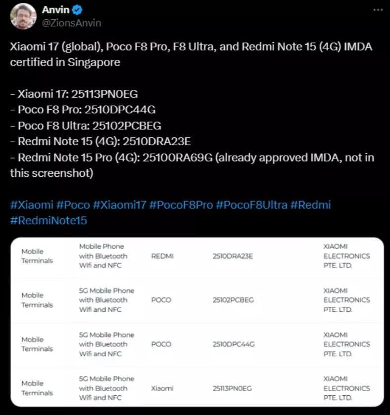 Αυτές οι συσκευές είναι τα POCO F8 Ultra, POCO F8 Pro αλλά και το Xiaomi 17, τα οποία έλαβαν πρόσφατα πιστοποίηση από την αρχή IMDA της Σιγκαπούρης, δείχνοντας ότι είμαστε πολύ κοντά στην επερχόμενη παγκόσμια κυκλοφορία τους. Στις παραπάνω συσκευές προστίθεται και το Redmi Note 15 (4G), το οποίο είναι επίσης έτοιμο για μια παγκόσμια διανομή.