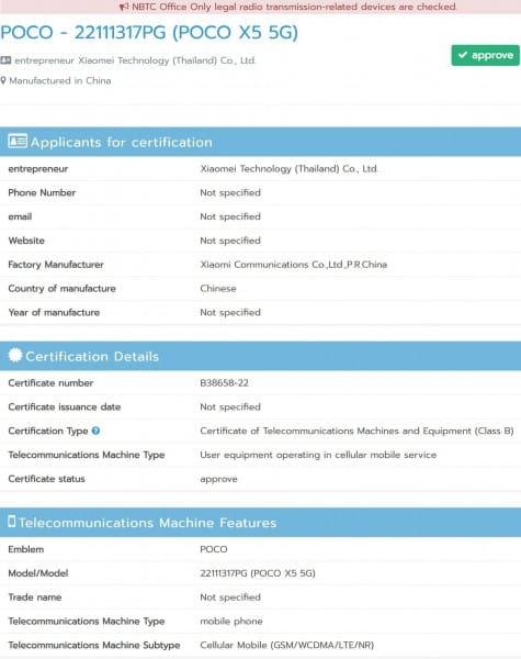 Το Poco X5 5G έχει καταχωρηθεί στην αρχή πιστοποίησης της Ταϊλάνδης με ονομασία μοντέλου 22111317PG, που είναι διαφορετικό από τις καταχωρήσεις που έγιναν στην FCC και την BIS.