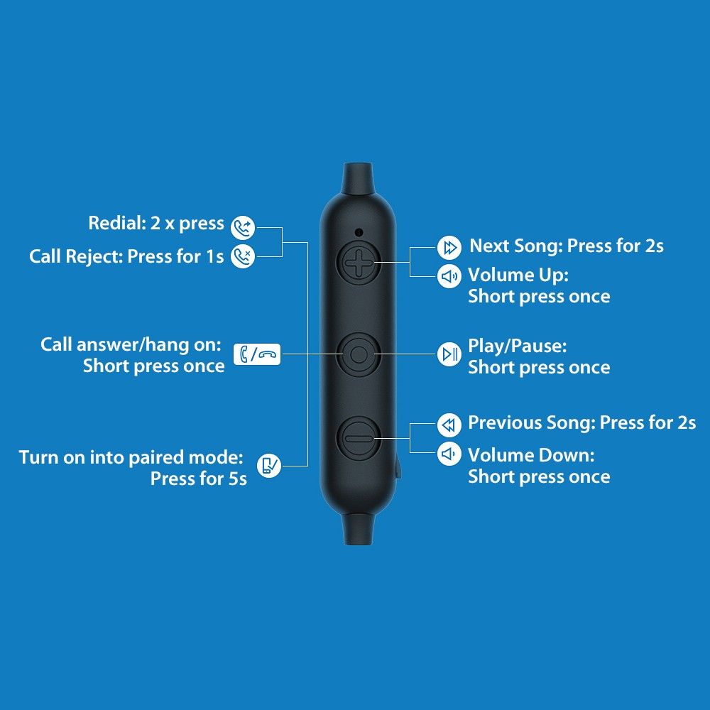 – Anwser/End/Refuse, Mute, Redial, Vol+/-, Pause/Play, Last/Next Song.