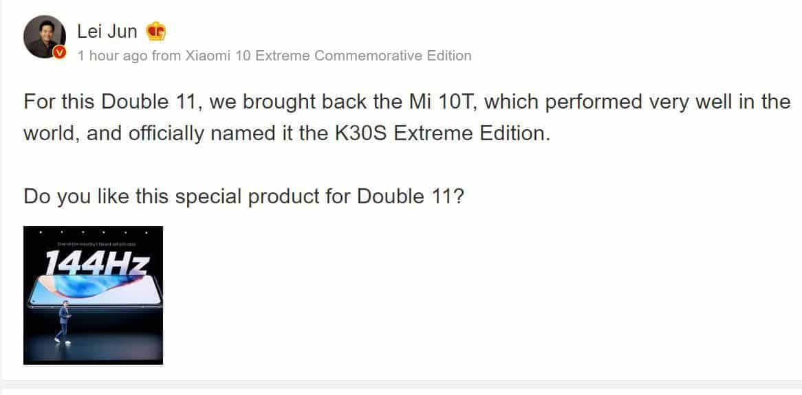 Έτσι λοιπόν η RedMi ετοιμάζεται να κυκλοφορήσει το νέο Smartphone με το όνομα RedMi K30S Extreme Commemorative Edition, και παρακάτω σας έχουμε το μήνυμα που δημοσίευσε ο Lu Weibing στο Weibo.