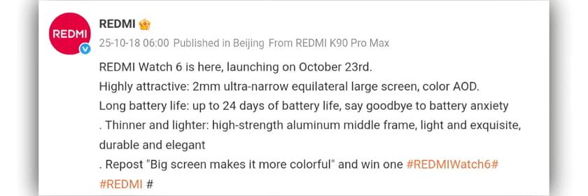 Η Redmi ανακοινώνει το Redmi Watch 6, το οποίο πρόκειται να κυκλοφορήσει μαζί με το Redmi K90 Pro Max στις 23 Οκτωβρίου