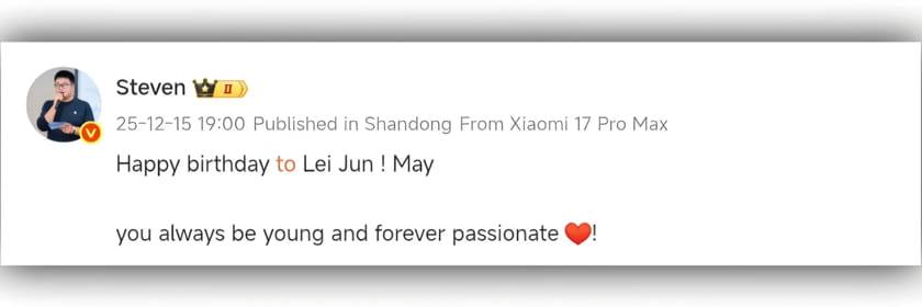 Νωρίτερα σήμερα, ο Steven Shen (Διευθυντής Νέων Μέσων της Xiaomi Corporation), μοιράστηκε ένα μήνυμα γενεθλίων στο Weibo, ευχόμενος στον Lei Jun χρόνια πολλά και λέγοντας: «Είθε να παραμένεις πάντα νέος και να συγκινείσαι πάντα μέχρι δακρύων».