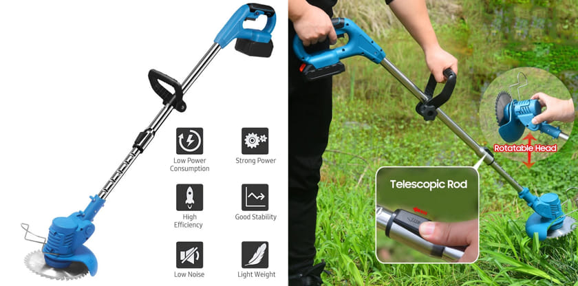 Αυτό το φορητό ασύρματο χλοοκοπτικό είναι βολικό και πρακτικό για οικογενειακή χρήση. Είναι εξοπλισμένο με 3 είδη λεπίδων για την κάλυψη διαφορετικών απαιτήσεων. Με την ρυθμιζόμενη κεφαλή μοτέρ και τηλεσκοπική ράβδο, τα άτομα διαφορετικού ύψους μπορούν εύκολα να το χρησιμοποιήσουν για το κόψιμο μαλακού γρασιδιού, τη συντήρηση γκαζόν, το κούρεμα γρασιδιού σε γκαζόν κήπου ή σύνθετο έδαφος, την κοπή καλλιεργειών, την κοπή θάμνων και στο κλάδεμα κ.λπ.