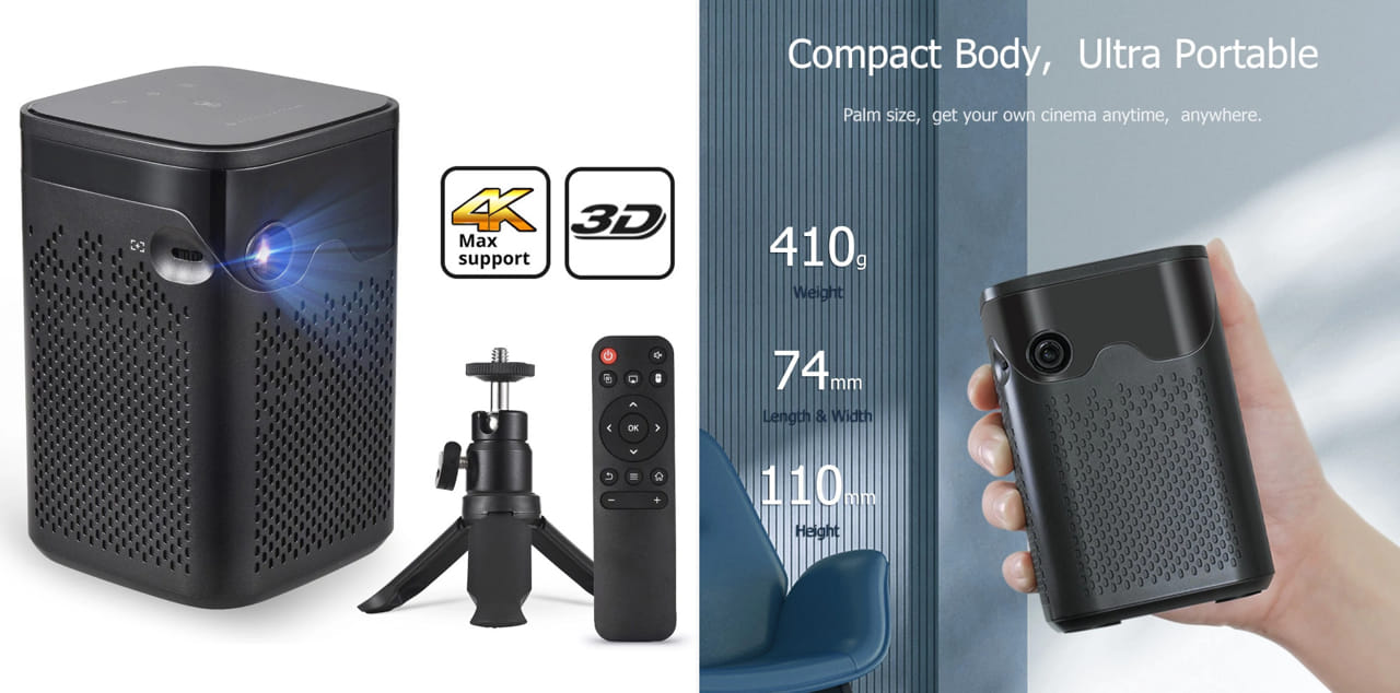 Με διαστάσεις στα 110x74x74mm έχει συμπαγές μέγεθος και ζυγίζει μόλις 410 γραμμάρια, καθιστώντας το πολύ πιο φορητό και με λιγότερο βάρος για να το μεταφέρετε πολύ εύκολα σε εξωτερικούς χώρους. Εσείς απλά βάλτε το στην τσάντα ή τη βαλίτσα σας, πάρτε το μαζί σας και ζήστε μια υπέροχη κινηματογραφική εμπειρία με τους φίλους, τους γονείς, τους συναδέλφους σας.