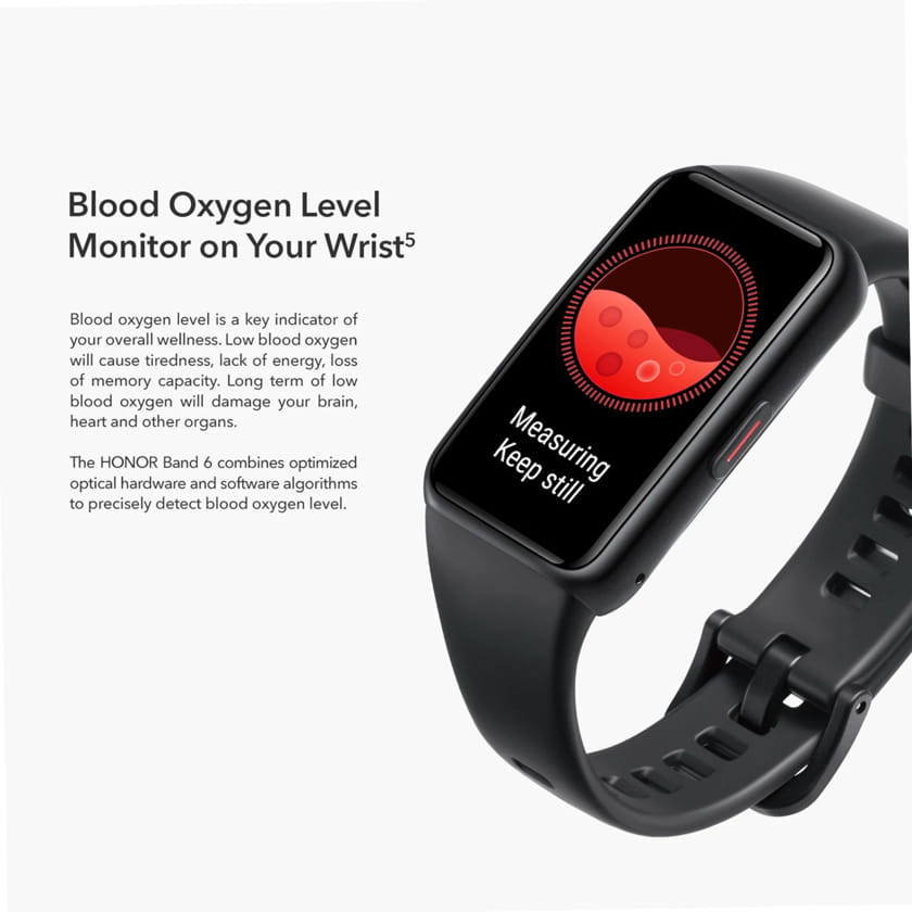 Ενεργοποιημένη από την παρακολούθηση κορεσμού οξυγόνου (SpO2) 2, το HONOR Band 6 μπορεί να ανιχνεύσει τα επίπεδα οξυγόνου στο αίμα των χρηστών, το οποίο είναι απαραίτητο για όσους παρακολουθούν την αναπνευστική τους υγεία ή που απολαμβάνουν πεζοπορία ή αναρρίχηση σε μεγάλα υψόμετρα.