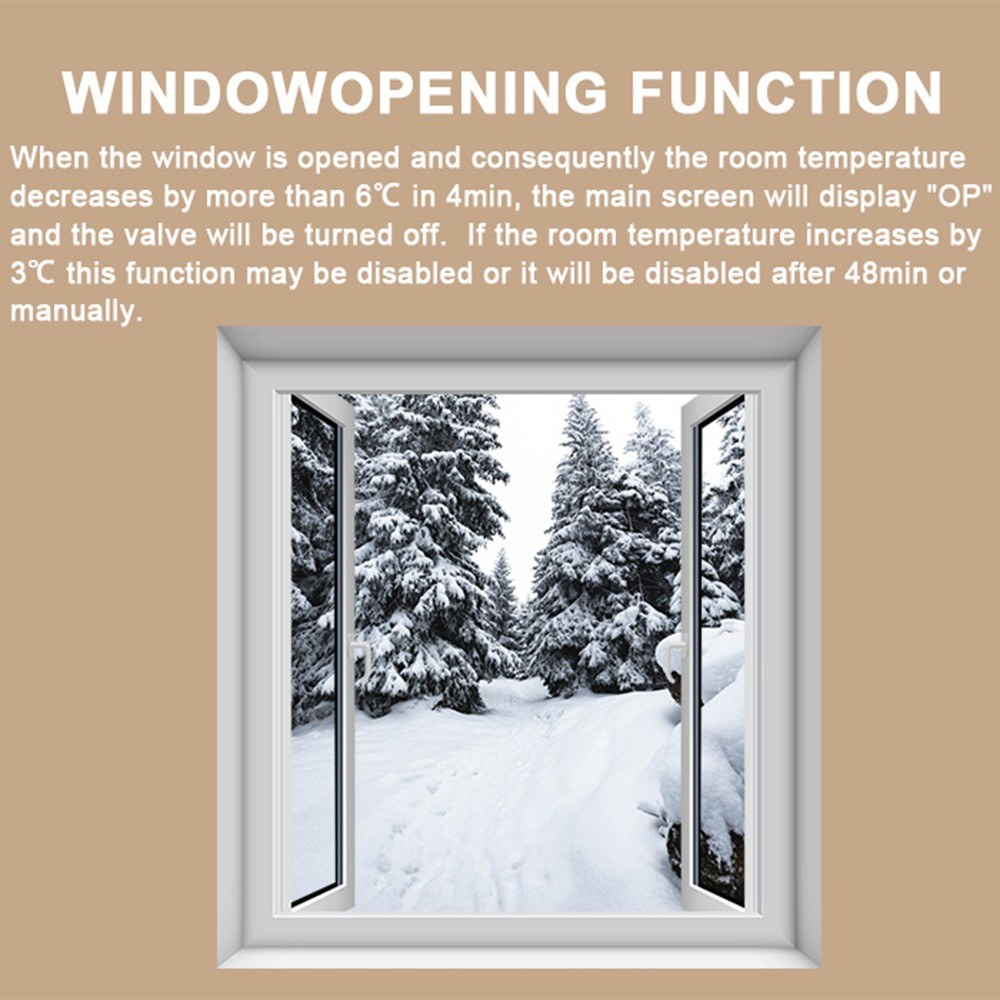 Διαθέτει ειδική λειτουργία ανοίγματος παραθύρου, ώστε όταν ανοίξετε το παράθυρο και κατά συνέπεια η θερμοκρασία δωματίου μειωθεί κατά περισσότερο από 6 ° C μέσα σε 4 λεπτά, η κύρια οθόνη θα εμφανίσει την ένδειξη “OP” και οι βαλβίδες θα απενεργοποιηθούν. Εάν η θερμοκρασία του δωματίου αυξηθεί κατά 3 ° C, αυτή η λειτουργία μπορεί να απενεργοποιηθεί αυτόματα μετά από 48 λεπτά ή θα απενεργοποιηθεί χειροκίνητα.