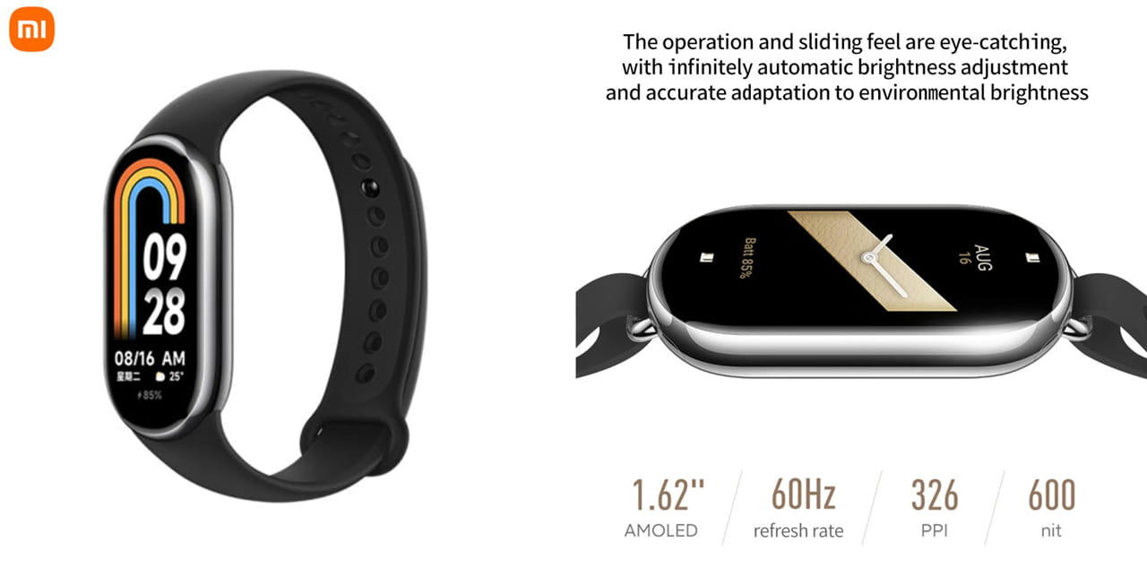 Το νέο Xiaomi Band 8 φέρνει σημαντικές αναβαθμίσεις σε σχέση με τον προκάτοχό του, ενώ διατηρεί το ίδιο σώμα σε σχήμα χαπιού που φιλοξενεί την AMOLED οθόνη 1.6 ιντσών. Η οθόνη προσφέρει ρυθμό ανανέωσης στα 60 Hz, έχει μέγιστη φωτεινότητα 600 nits, υποστηρίζει την λειτουργία AOD και διάφορες προσόψεις ρολογιού, ενώ η συσκευή είναι και ανθεκτική στο νερό έως και τα 50 μέτρα.