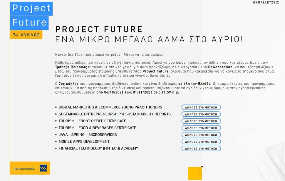 Η Τράπεζα Πειραιώςσυνεπής στη δέσμευσή της να στηρίζει τους νέους της χώρας, υλοποιεί τον 7ο  κύκλο του προγράμματος εταιρικής υπευθυνότητας Project Future, το οποίο διευρύνεται με νέες εκπαιδεύσεις σε τομείς αιχμής και με νέες συνεργασίες.