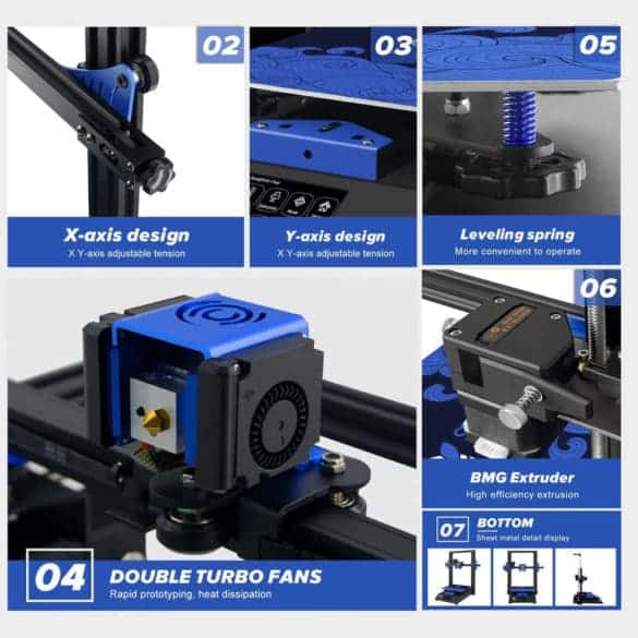 - Έχει μέγιστο μέγεθος εκτύπωσης είναι 235 * 235 * 280mm, και μπορεί να υποστηρίξει διάφορα νήματα εκτύπωσης στα 1,75mm, όπως PLA, ABS, PETG και νήματα ξύλου.