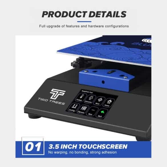 - Ο κεντρικός πίνακας του 3D εκτυπωτή TWO TREES BLUER χρησιμοποιεί MKS ROBIN NANO V1.1, έγχρωμη οθόνη αφής 3,5 ιντσών, η οποία είναι εύκολη στην ανάγνωση και τη λειτουργία, και υποστηρίζει πολυγλωσσική διεπαφή : Αγγλικά, κινέζικα, γαλλικά, γερμανικά, ρωσικά, κορεατικά και ισπανικά.