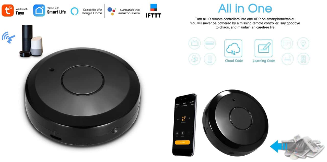 Με αυτή την συσκευή μπορείτε να ελέγξτε όλες τις συσκευές που διαθέτουν υπέρυθρες (IR) μέσω της εφαρμογής Tuya Smart ή Smart Life App, από οπουδήποτε και ανά πάσα στιγμή, μετατρέποντας μα αυτό τον τρόπο τις βασικές οικιακές συσκευές σας σε έξυπνες συσκευές και κάνοντας τη ζωή πιο εύκολη.